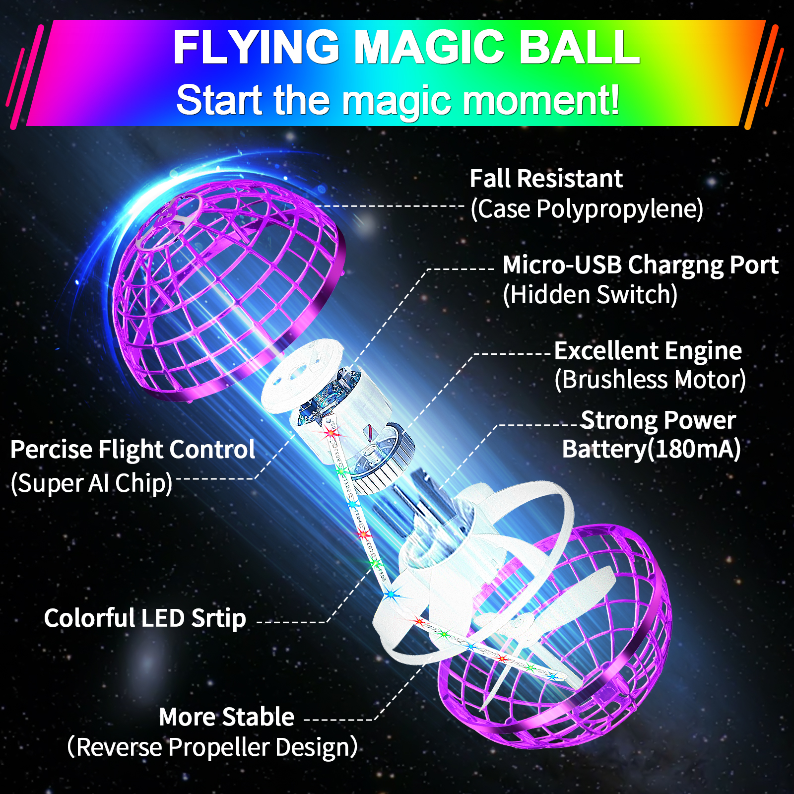 - High-Tech Hand Control flying ball toy: Super cool magic flying ball! After lightly pressing the button, open the palm of your hand, hold the bottom of the flying ball and start flying. Different throwing angles and speeds will create different flight paths and boomerang effects. If you want to stop the flight, just shake the flying space ball and stop the rotation.The colorful LEDs on the magic ball toy at night will make your parachute gravity ball even cooler! Great indoor toy!
